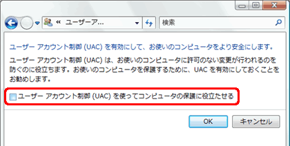 5.[ユーザー アカウント制御(UAC)を使ってコンピュータの保護に役立たせる]の チェックボックスをオフにします。 |
